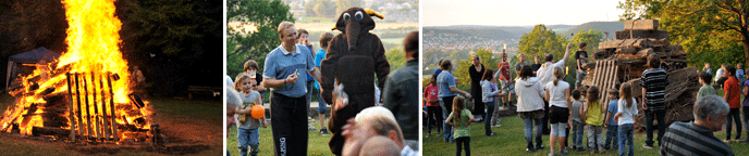 Beginn um 18:30 Uhr mit dem Gottesdienst. Wir versuchen auch eine Kirchenband für die Gestaltung zu gewinnen. Das Anzünden des Feuers übernehmen (ab 2011) die Kommunionkinder des jeweiligen Jahrgangs. Ein stimmungsvoller Abend für Jung und Alt mit Bewirtung. Am Feuer singen wir, begleitet von der Gitarre, bekannte Lieder. Jeder darf mitsingen und auch sein Instrument mitbringen.